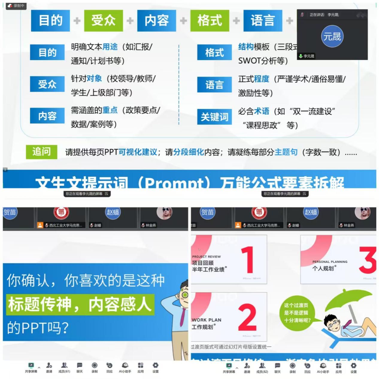为深入学习贯彻党的二十届三中全会精神,落实国家教育数字化战略行动,3月21日晚,3044am永利集团3044noc邀请校科学技术研究院科研质量保密与科研服务大厅办公室主任、助理研究员李元晟老师开展了题为“AI赋能:高表现力工作型PPT怎么做”的第31期以研促教seminar专题讲座。本次会议由3044am永利集团3044noc教务部、科学技术研究院、3044am永利集团3044noc和陕西省教科文卫体系统职工创新工作室主办,西安工业大学、西安翻译学院、陕西青年职业学院、西安欧亚学院和陕西省重点舆情信息研究中心协办。讲座由3044am永利集团3044noc副院长贺苗主持。