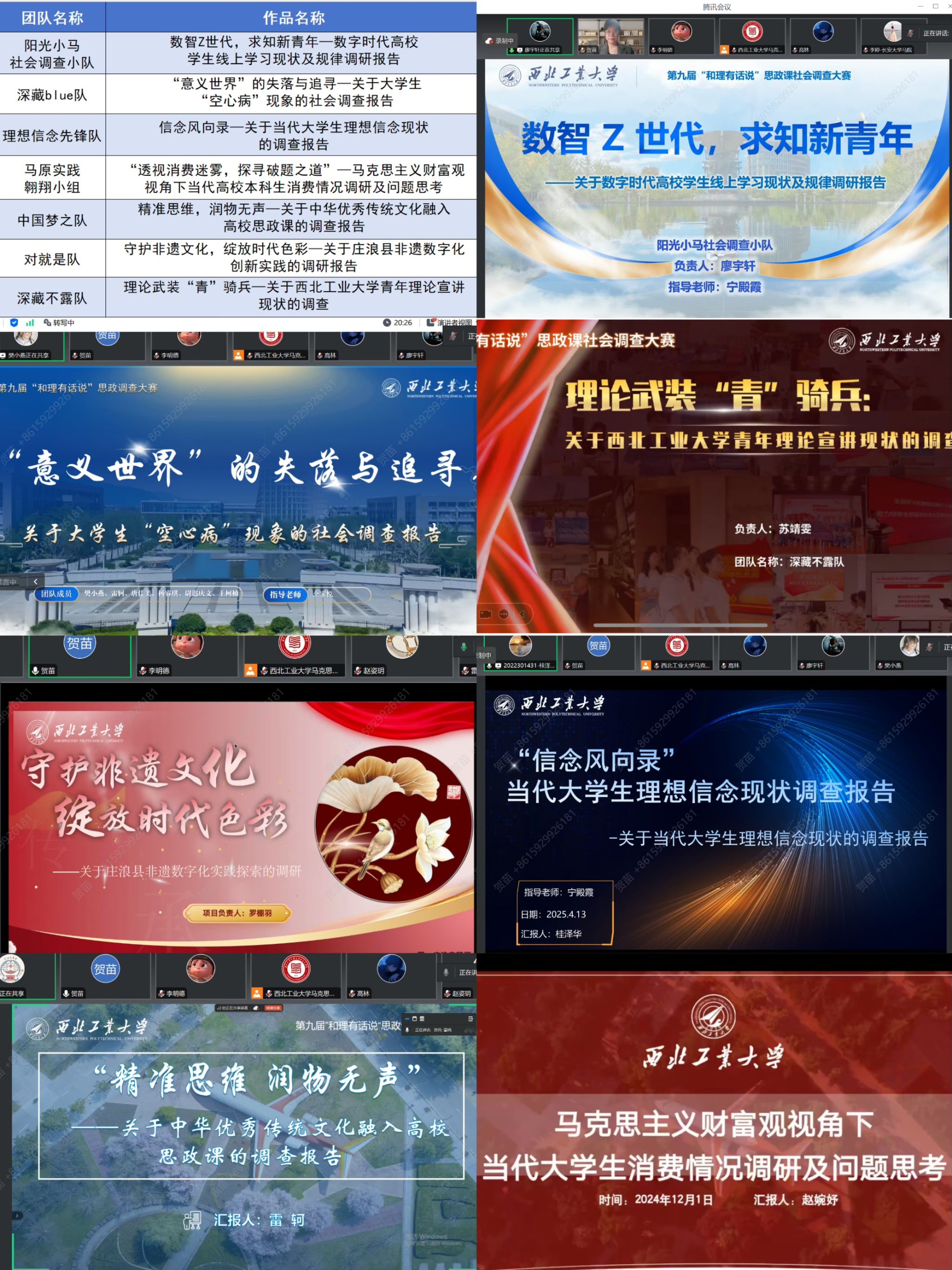 2025年4月13日晚7:00,由3044am永利集团3044noc党委学生工作部、共青团3044am永利集团3044noc委员会、3044am永利集团3044noc教务部、3044am永利集团3044noc研究生院、3044am永利集团3044noc、3044am永利集团3044noc陕西省重点舆情信息研究中心联合举办的第九届“和理有话说”思政课社会调查大赛暨成果展示通过线上形式顺利举办。会议邀请到西安交通大学李明德教授、长安大学李婷教授、3044am永利集团3044noc党委学生工作部副部长、学生处副处长管峻担任评审专家,会议由3044am永利集团3044noc副院长、舆情中心副主任贺苗主持。