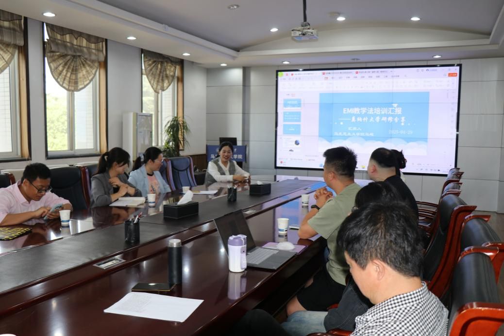 赵海霞教授以“学理论、用技巧、重实践”为题,一步步从学习收获、实践体会、思考认识等方面进行分享,生动回顾培训课程真实情景,全面展示了EMI教学法的理论基础与教学理念,对比中外教学方式,并提出了自身关于思政课教学技巧应用与工具使用的思考。